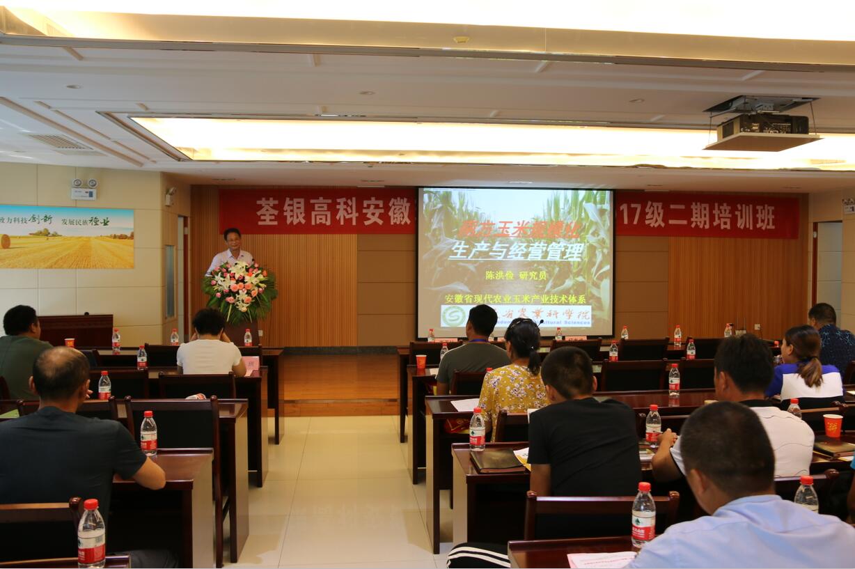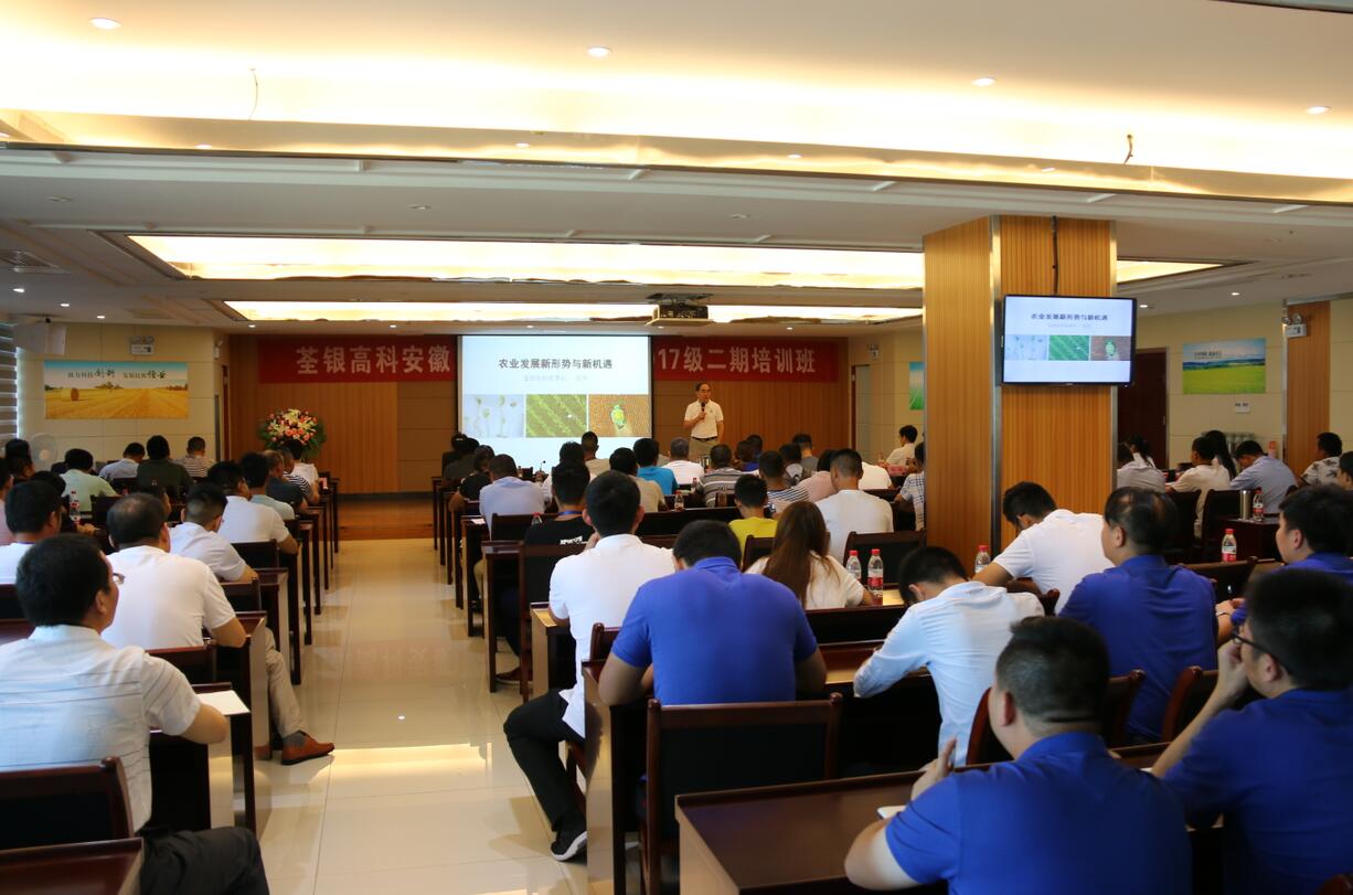 ??? 2018年7月19日,由安徽省農委主辦、荃銀高科承辦的安徽現代青年農場主培訓2017級第二期培訓活動在公司六樓多功能廳展開。安徽荃銀高科董事長張琴、營銷總監王玉林,培訓班總教務長楊惠成老師,安徽張海銀基金會秘書長張彤,及來自全省各地的100多位從事種植業的農場主學員參加了培訓。